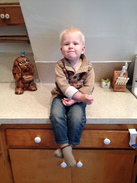 This is just something he figured out how to do on his own–crossing his fingers, hands, and feet. He seems to take a lot of pride in this. This is also the face he makes when asked to smile.
