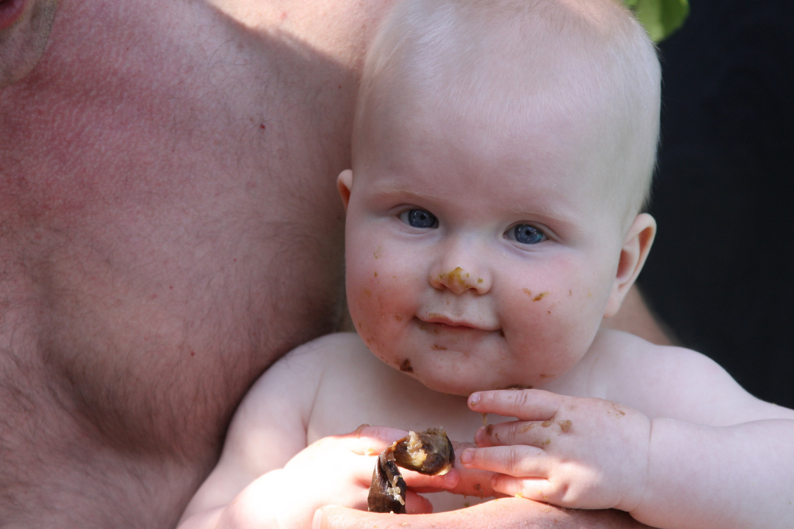 He really enjoys playing with and gumming on the banana peel. With no teeth there is no danger of him biting off a piece, so it’s a good way to keep him happy and entertained for a while. Sure is messy though!