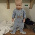 He loves sound effects.  He knows the noises that dogs, cats, birds, and bears make and he is trying to refine his pig snort.  He also learned how to make the tick-tock sound of a clock.  When he falls down he likes to say “plop!”  He likes to poke your nose and say “Boop.”